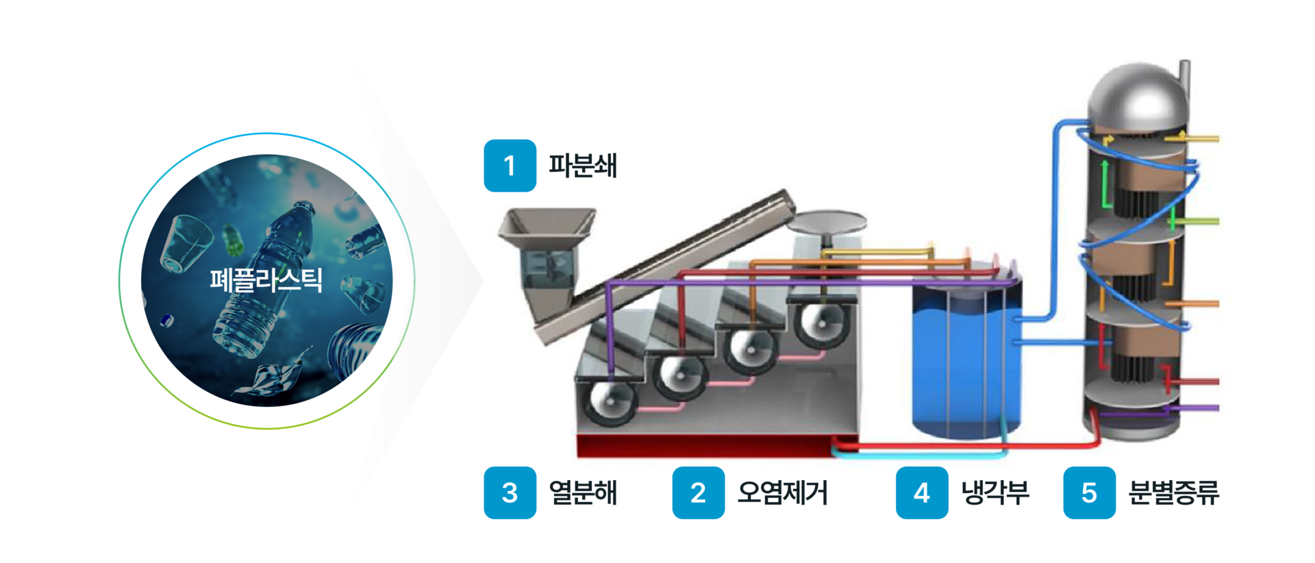 아크론에코의 초음파 열분해(SONOPYRO) 시스템은 (1) 연속운전이 가능한 무산소 열분해 기술이며, (2) 초음파 기술 적용으로 시스템 운영의 안정성과 효율성을 확보하였습니다. 더불어 (3) 나노 촉매를 활용한 폐수처리를 통해 폐수처리비용을 절감하였고, (4) 열분해유 고객사가 요구하는 성상 충족을 위해 소형 증류탑을 구성하였습니다.